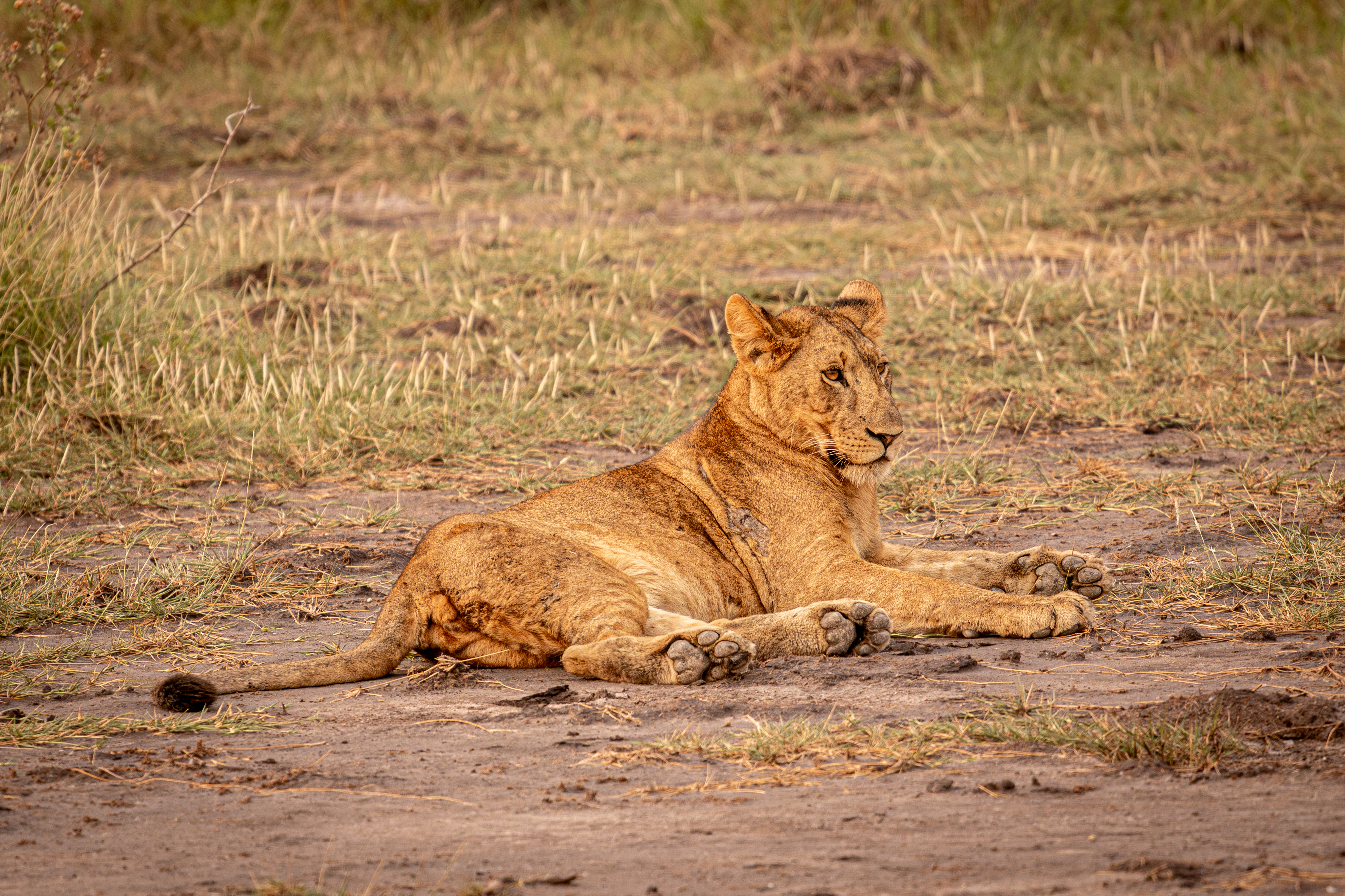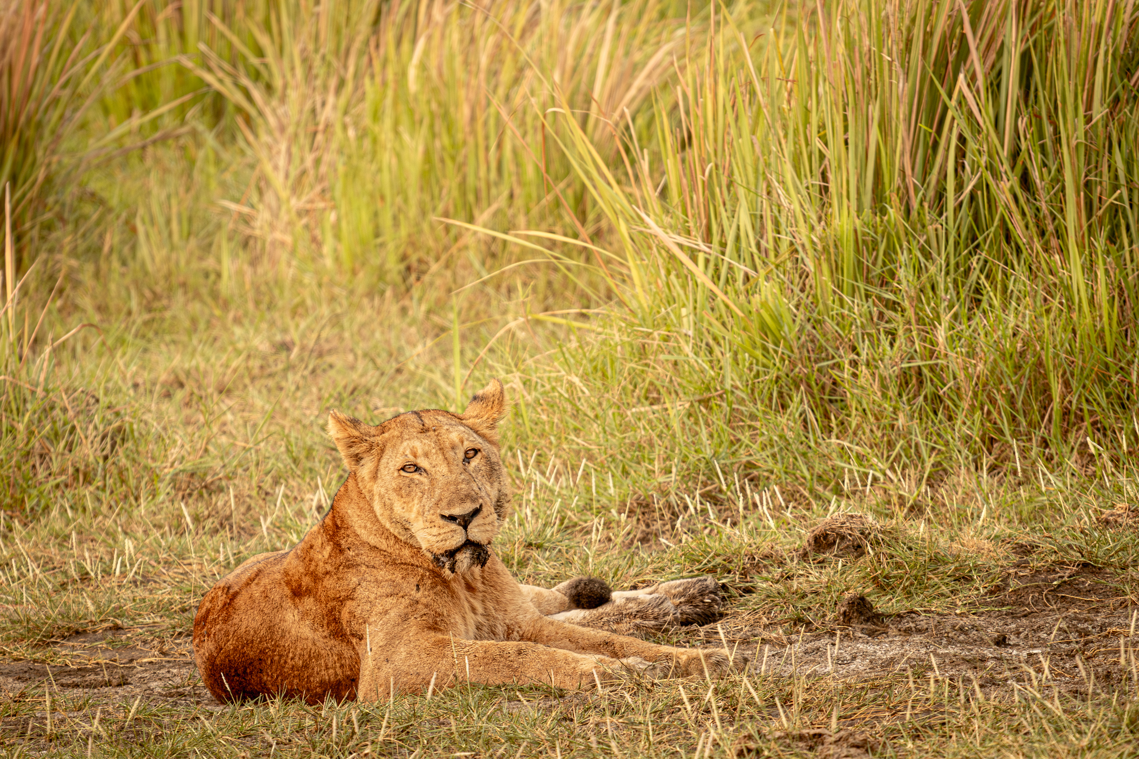 The next finding was a freshly killed buffalo and two lions nearby. At first, we only saw one lion lying on the ground.
